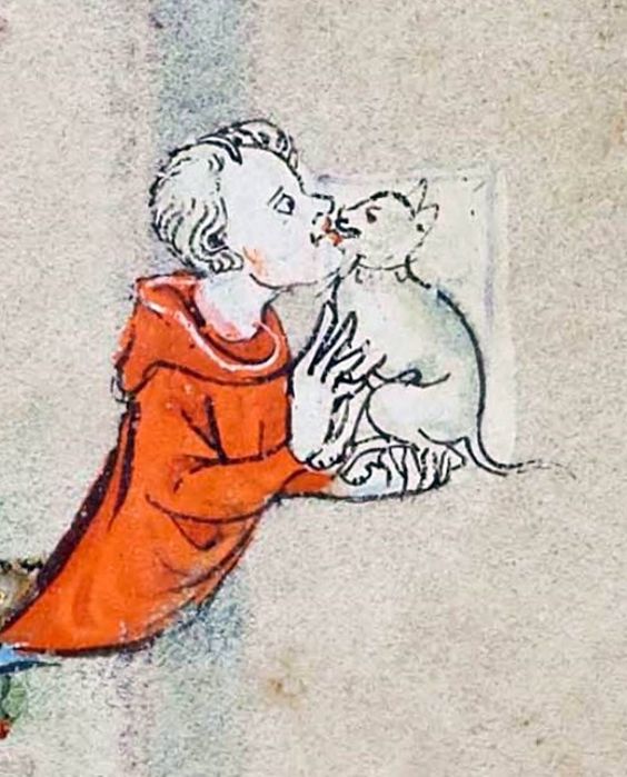 I know it is a “cliche” of author websites to post an update like this once and then never post again, or rarely, so I won’t promise much here. But I hope to reliably post upcoming readings, publications, and other news in this space. In the meantime, you can read through my back catalogue (if that is what you are into) or simply enjoy this medieval illustration of a man french kissing a cat.